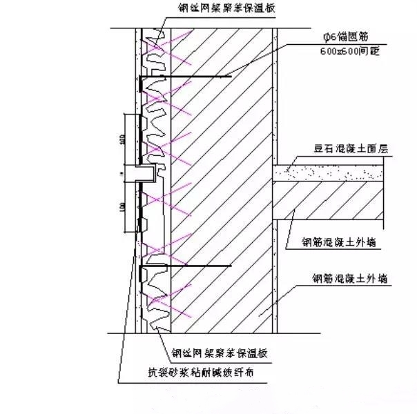 保溫板外側低碳鋼絲網片均按樓層層高斷開,互不連接。沿板拼縫方向每600mm用150×150“U”型8#鉛絲穿過縫兩側保溫板同墻內鋼筋綁扎牢固。
