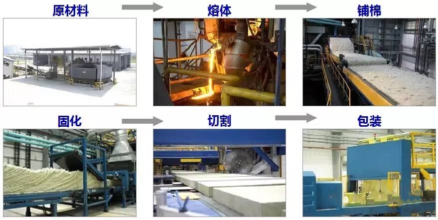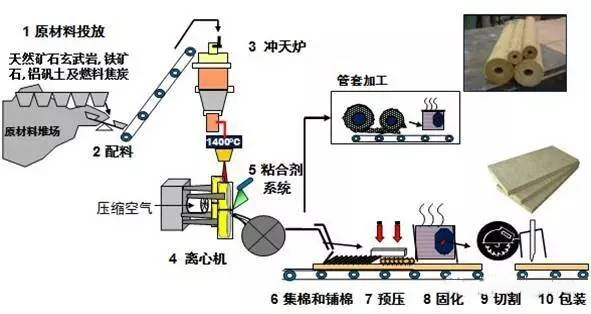 將各類天然巖石在“沖天爐”通過高溫熔化成液體后,再經過“離心機”吹制成巖棉纖維(加入適量粘結劑、防塵劑、憎水劑等外加劑),然后進行“鋪棉”工藝,最終生成巖棉板。具體生產流程如下圖: