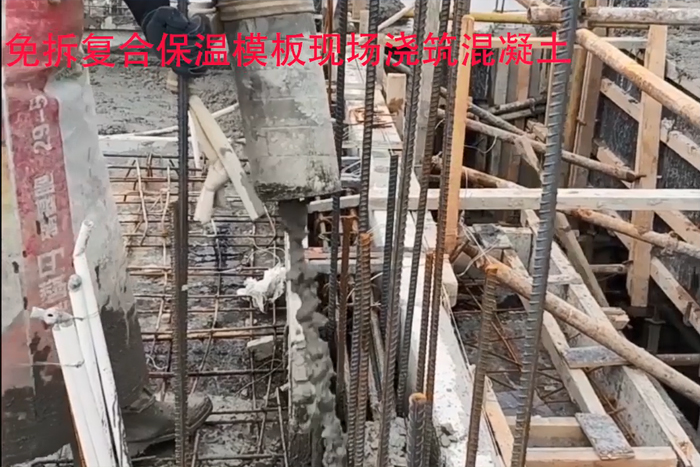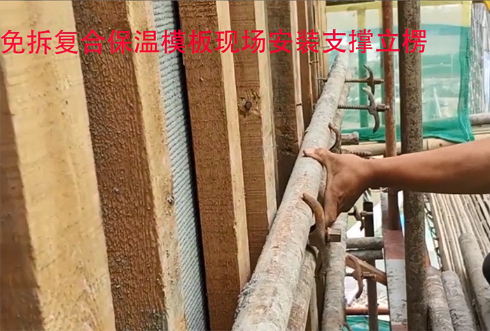 CQ 免拆復(fù)合保溫模板系統(tǒng)連接件中心間距最小距離為200mm,最大不超過650mm,施工過程中采用普通混凝土澆筑保溫層,可在施工時按規(guī)范要求振搗,因在免拆模板外加裝有固定的立楞、次楞,保證振搗施工時保溫板不會被破壞。符合傳統(tǒng)施工工藝施工,不限制工人的監(jiān)工習(xí)慣。