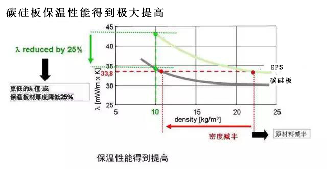 碳硅板的突出絕熱能力在低密度時表現的特別明顯。當保溫系統達到0.045W/(m.k)的低導熱系數時。采用碳硅板要比采用常規的EPS保溫板節省40%的成本。
