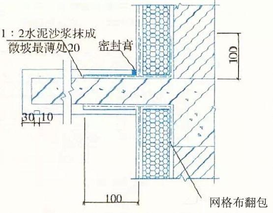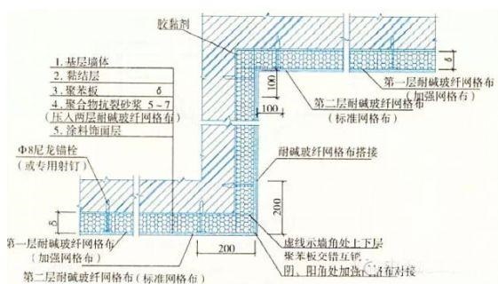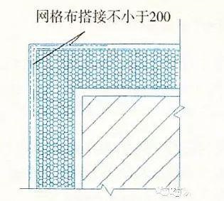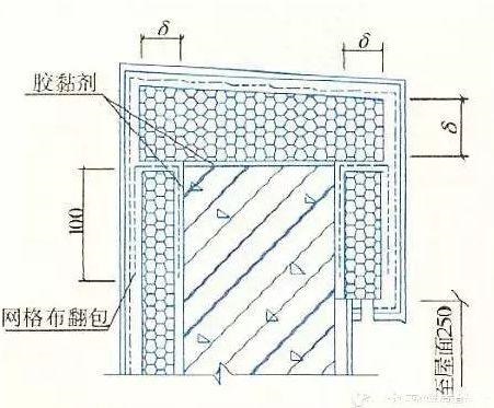 (2)裝飾縫、門窗四角等處應做局部加強網施工。陰陽角需從兩側雙向繞角且陽角搭接寬度不小于200mm,陰角搭接寬度不小于100mm。遇門窗口、通風口及與不同材質的接合處(配電箱、水管等),粘板前應先鋪設一道200mm寬的翻包網格布,應將增強網布翻邊包緊保溫板;洞口的四角應各貼一塊增強網布,并用聚合物砂漿將網布折疊部分抹平封嚴。