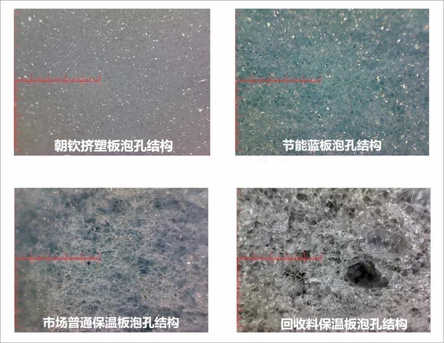 下面四種擠塑板的微觀結(jié)構(gòu)圖。白晶板的泡孔均勻且封閉。藍(lán)板泡孔封閉良好。黑板沒有泡孔基本沒有封閉。