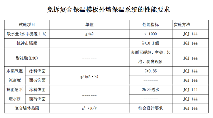 透氣性(水蒸氣濕流密度)這項技術指標是指水汽擴散阻力。水汽會對免拆復合保溫模板的保溫系統產生多種破壞,如保溫性能降低、凍融破壞、材料起泡、水與空氣中的酸性氣體反應變為酸而對系統產生的損壞等,因此免拆復合保溫模板的保溫系統應防止雨、雪浸人,防止內表面和隙間結露。