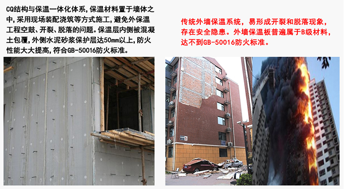 CQ免拆復合保溫模板體系適用于8度及8度以下抗震設防區及費抗震設防區,火災發生時,混凝土不會出現大塊墜落現象,不會對救援及逃生人員造成二次傷害。